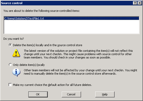 When choosing the first option, it is most likely you'll be causing unbuildable enlistments for other team members (see possible issues above, in Visual Studio 2003 section).