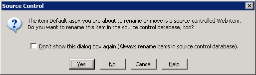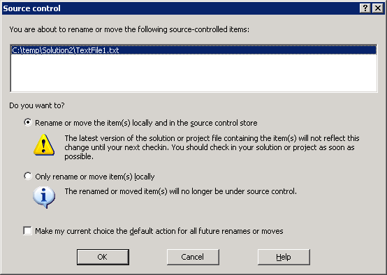 In Visual Studio 2005 when you rename or delete a file or folder, beside the dialog displayed by the project system, the source control integration will prompt you with a second dialog similar to the ones below. This dialog will allow to specify wich files do you want to delete or rename: only the local one, or to propagate the local change into the source control database.