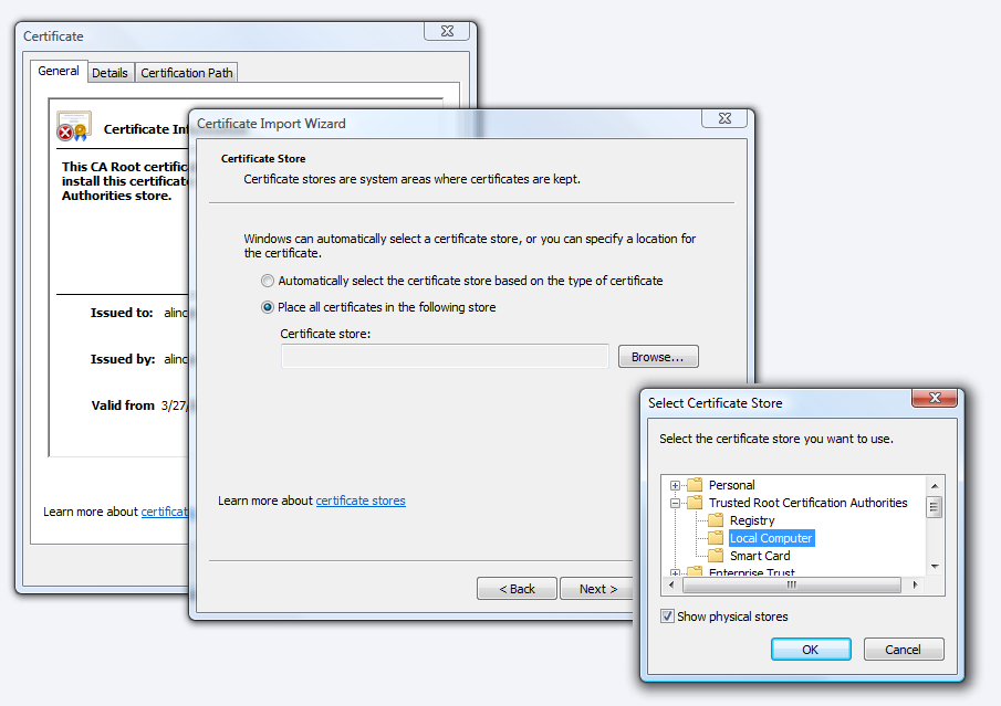 explicitely select the "Trusted Root Certification Authorithies/Local Computer"