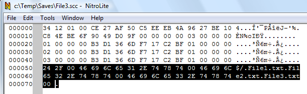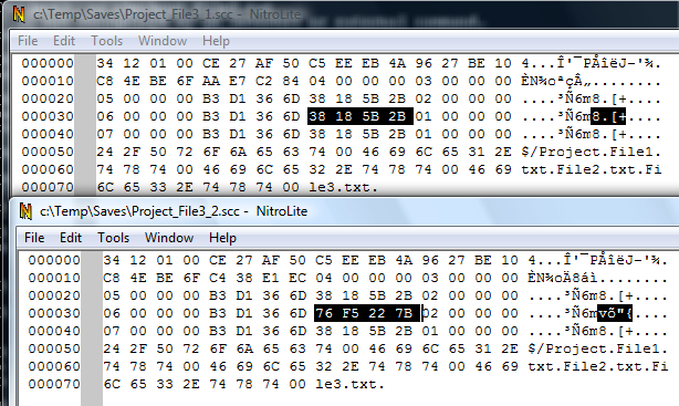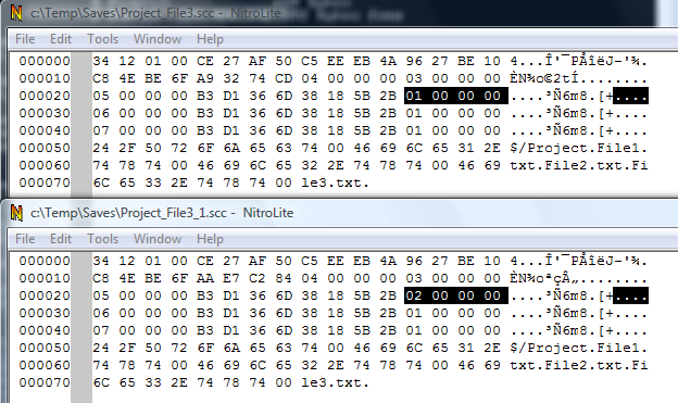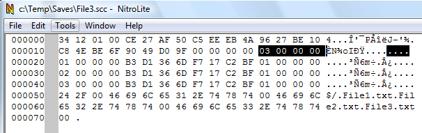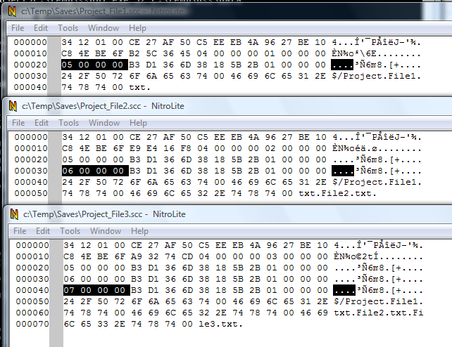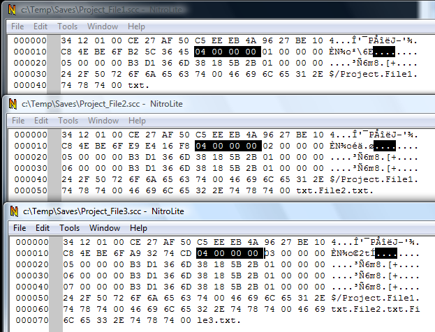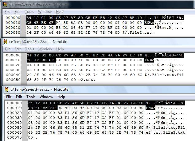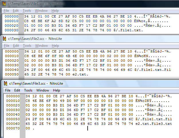 Now let's look with a binary editor at the 3 scc files we saved.