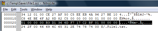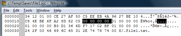 If you compare now the saved file with its previous version, you'll see that last 4 bytes have changed in the File1.txt's record.