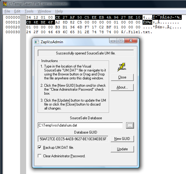 resetting the SourceSafe admin password, it can be used to display (and change if necessary) the GUID of a